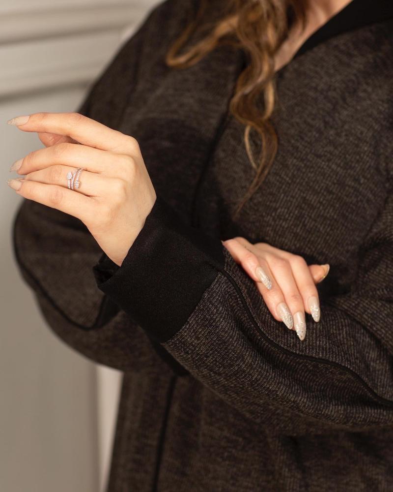 - نقدم لكم هذا التصميم باللون الرمادي، مع أكمام باللون الأسود، يضفي عليها شيئًا من السحر والأناقة.